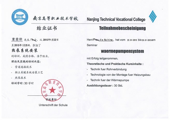 經(jīng)過(guò)30學(xué)時(shí)的培訓(xùn),我公司同事獲得南京高等職業(yè)技術(shù)學(xué)校所頒發(fā)的結(jié)業(yè)證書(shū),培訓(xùn)內(nèi)容包括空氣能(空氣源)熱泵管道連接技術(shù)、獨(dú)立采暖系統(tǒng)安裝工藝、熱泵技術(shù)等內(nèi)容,理論與實(shí)訓(xùn)安裝相結(jié)合,便于更加全面掌握空氣能(空氣源)熱泵知識(shí)。